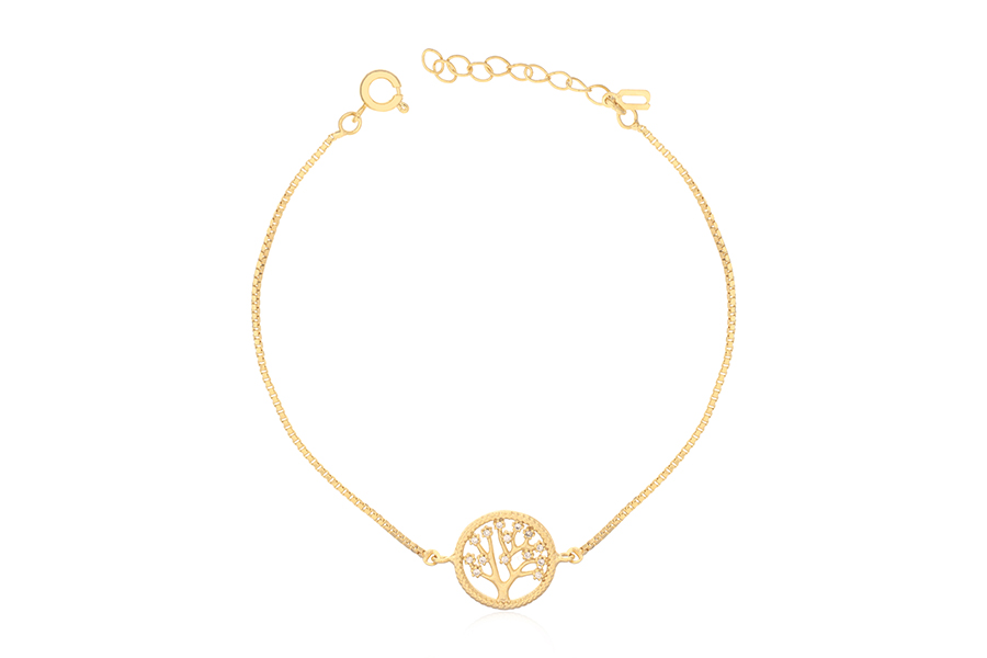 PULSEIRA BANHADA EM OURO, ELO VENEZIANA 0,80mm, 17cm COMPRIMENTO, EXTENSOR 3cm COMPRIMENTO E ÁRVORE DA VIDA 14mm DIÂMETRO