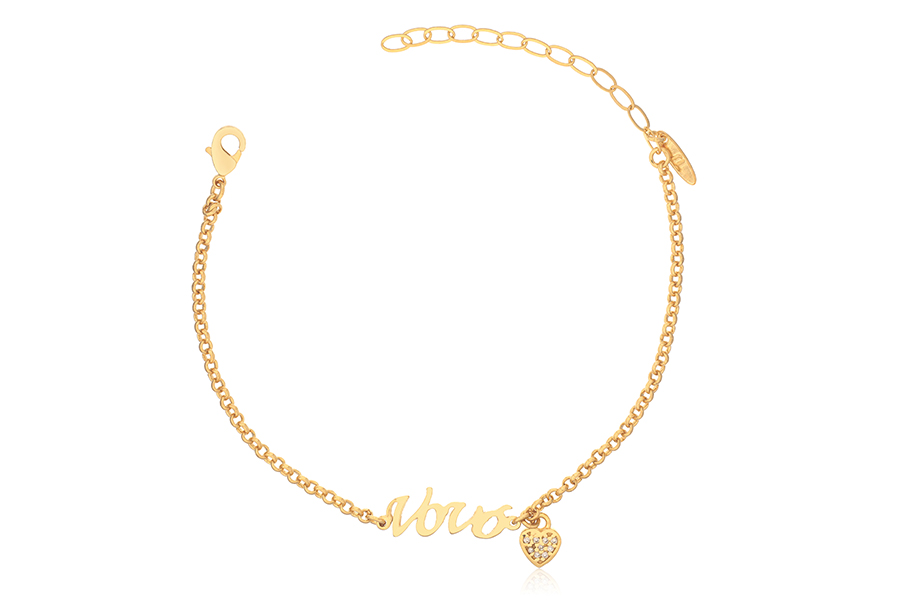 PULSEIRA BANHADA EM OURO, ELO PORTUGUÊS 2,50mm DIÂMETRO, 17cm COMPRIMENTO, EXTENSOR 5cm COMPRIMENTO, CORAÇÃO CRAVEJADO 6,50mm LARGURA, VOVÓ