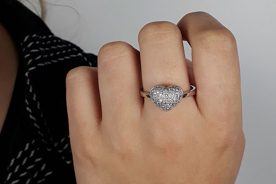 ANEL BANHADO EM RÓDIO BRANCO, CORAÇÃO 13mm LARGURA