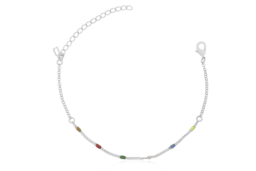 PULSEIRA BANHADA EM RÓDIO BRANCO, ELO GRUMET 1,40mm LARGURA COM PEDRAS COLORIDAS, ELO PORTUGUÊS 1,80mm, 16cm COMPRIMENTO E EXTENSOR 5cm COMPRIMENTO
