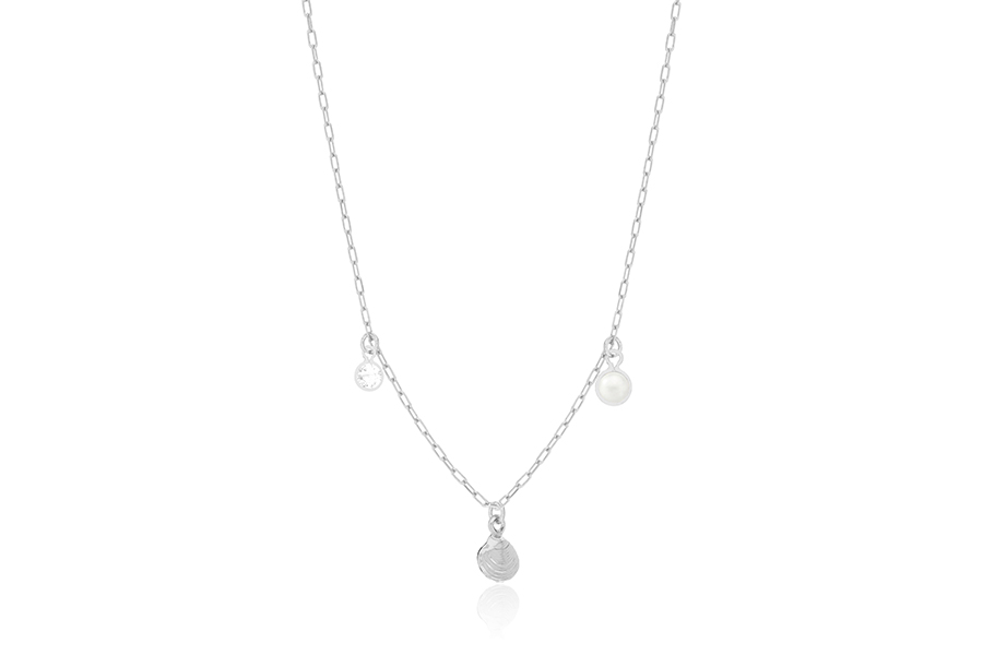 CHOKER BANHADA EM PRATA LEVE, ELO CARTIER 3x1,50mm, 36cm COMPRIMENTO, EXTENSOR 10cm, CONCHA, PÉROLA ACHATADA E PONTO DE LUZ