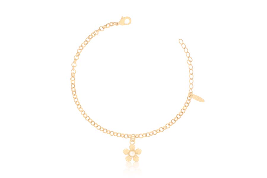 PULSEIRA BANHADA EM OURO, ELO PORTUGUÊS 2mm, 13cm COMPRIMENTO, EXTENSOR 3cm E FLOR 10mm LARGURA