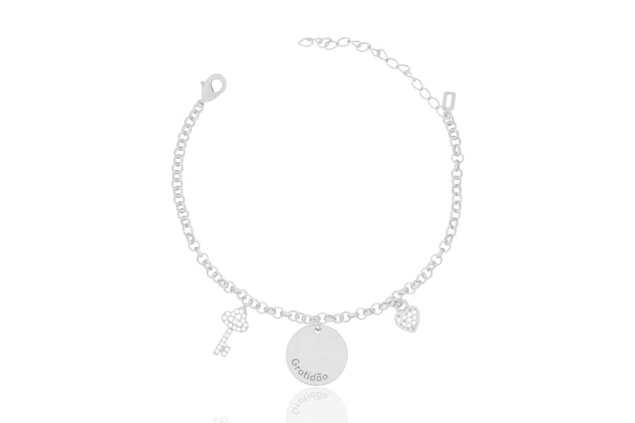 PULSEIRA BANHADA EM PRATA LEVE, ELO PORTUGUÊS 3mm, 16cm COMPRIMENTO, EXTENSOR 5cm, CHAVE 13mm COMPRIMENTO, MEDALHA GRATIDÃO 15mm DIÂMETRO E CORAÇÃO 7mm LARGURA