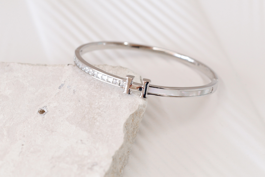 BRACELETE BANHADO EM RÓDIO BRANCO, MEIO ARO CRAVEJADO COM ZIRCÔNIAS QUADRADAS E MEIO ARO COM MADREPÉROLA, 4mm LARGURA, 6cm DIÂMETRO