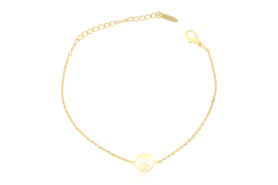 PULSEIRA BANHADA EM OURO, INFANTIL, MELINDROSA, ELO VENEZIANA LONGA 1,50mm ESPESSURA, CHAPINHA COM MENINA 24mm COMPRIMENTO E EXTENSOR 3,50cm COMPRIMENTO