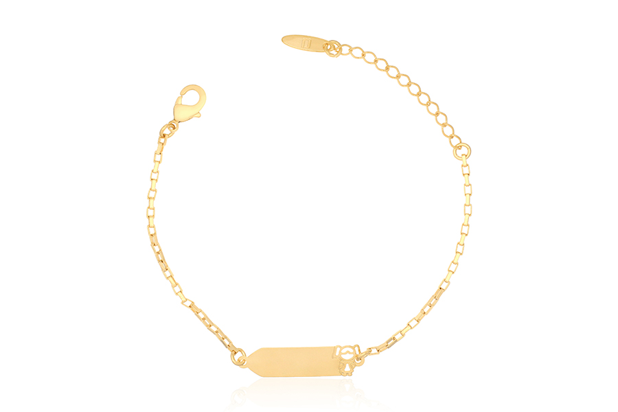 PULSEIRA BANHADA EM OURO, INFANTIL, MELINDROSA, ELO VENEZIANA LONGA 1,50mm ESPESSURA, CHAPINHA COM MENINA 24mm COMPRIMENTO E EXTENSOR 3,50cm COMPRIMENTO