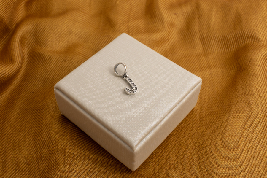 PINGENTE EM PRATA, LETRA ''J'' CRAVEJADA