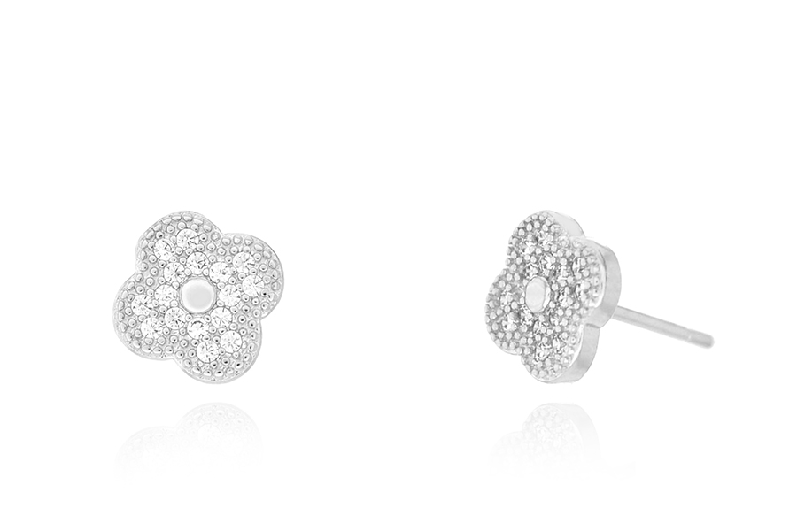 BRINCO EM PRATA, TREVO VAZADO CRAVEJADO 13mm ALTURA