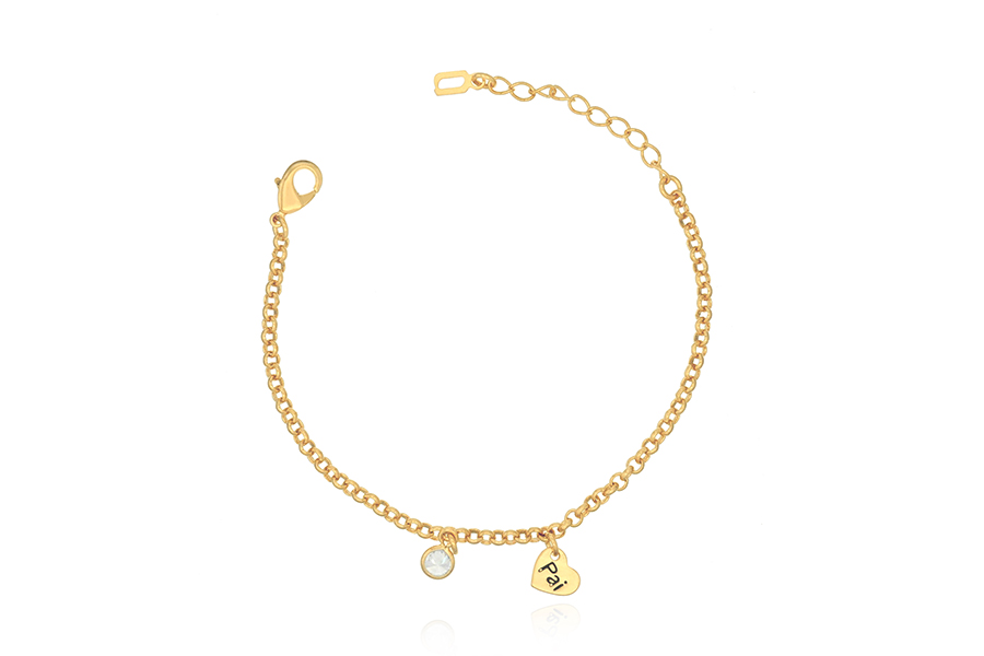 PULSEIRA BANHADA EM OURO, INFANTIL, ELO PORTUGUÊS 2,50mm, 13cm COMPRIMENTO, EXTENSOR 3cm COMPRIMENTO, PONTO DE LUZ E CORAÇÃO PAI
