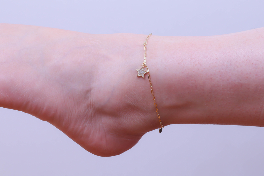 TORNOZELEIRA BANHADA EM OURO, ELO CARTIER 4,20x1,90mm, 23cm COMPRIMENTO, EXTENSOR 5cm E ESTRELA 10mm LARGURA